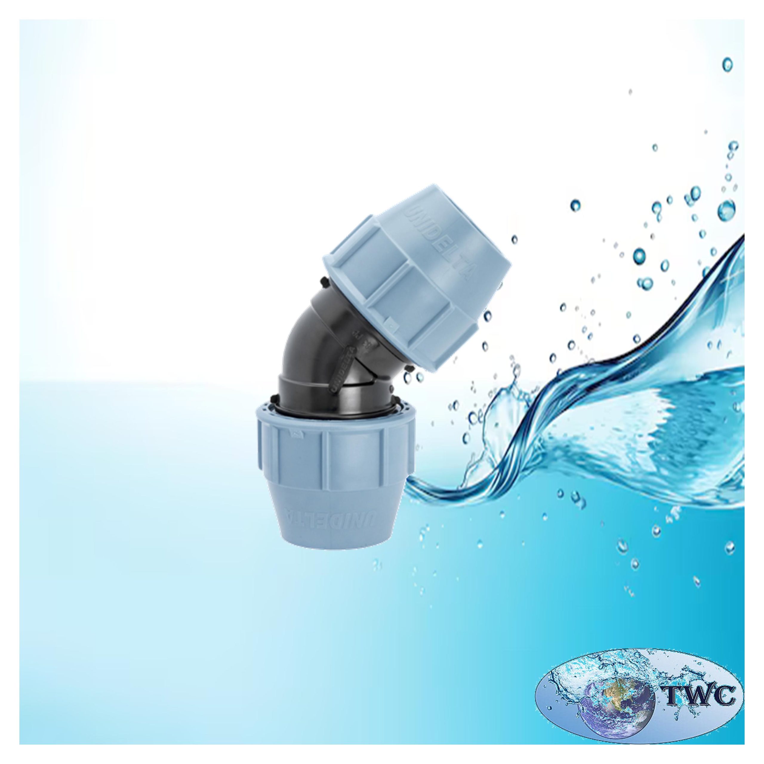 Firstly Unidelta Elbow 45° 63mm is a polypropylene compression fitting designed to join polyethylene pipes at a 45-degree angle, changing the direction of flow. These fittings, made from durable, UV-resistant material, are used in various applications, including drinking water distribution, irrigation, and agricultural systems, connecting PE pipes for fluids at pressures up to 16 bar. For this reason their corrosion resistance, ease of installation without special tools, and ability to create leak-proof hydraulic seals.