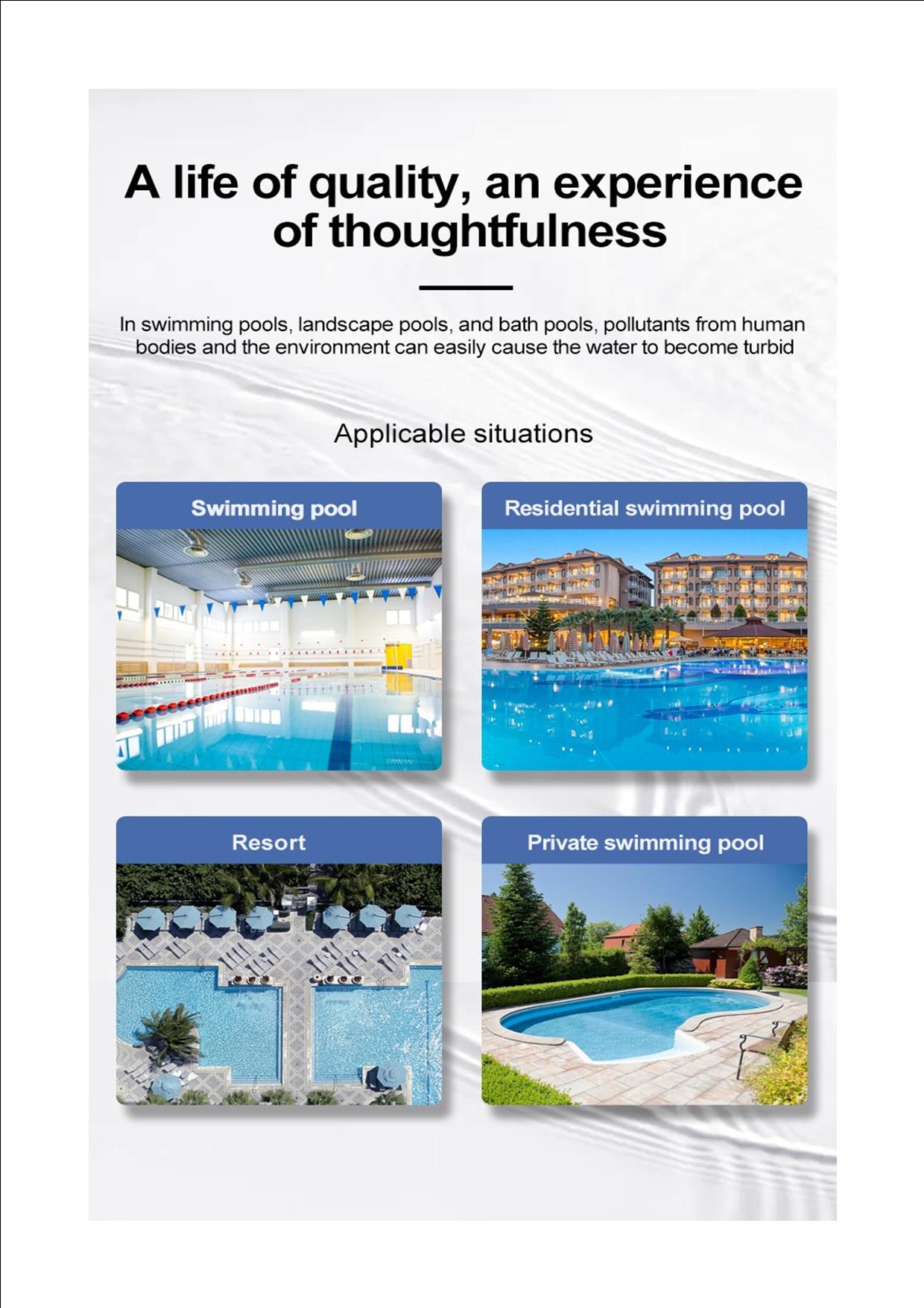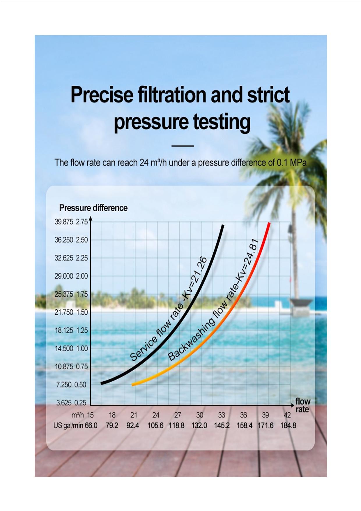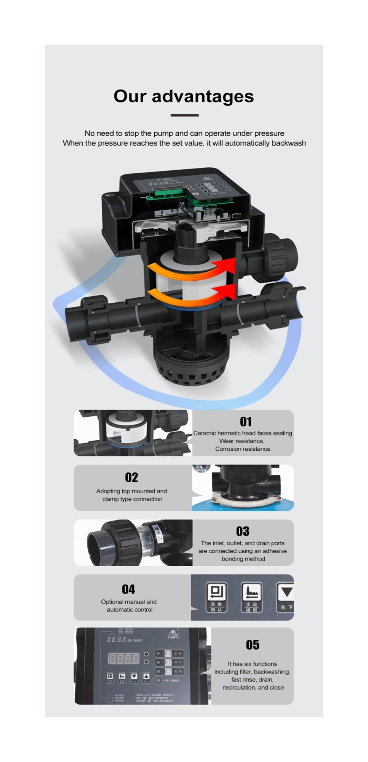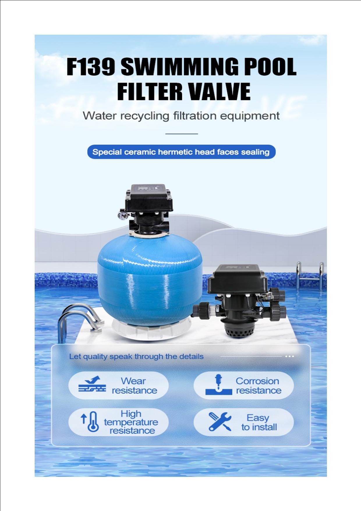 Firstly it is suitable for various swimming pool sizes. For example community pools, gymnasium pools, hot spring pools, water parks, resorts, and landscape pools. Furthermore the temperature can vary of 5-50 ℃. It adopts hermetic head faces with high degree pottery and corrosion resistance for opening and closing. It combines with Filter, Backwash, Rinse, Waste, Recirculation and Closed.