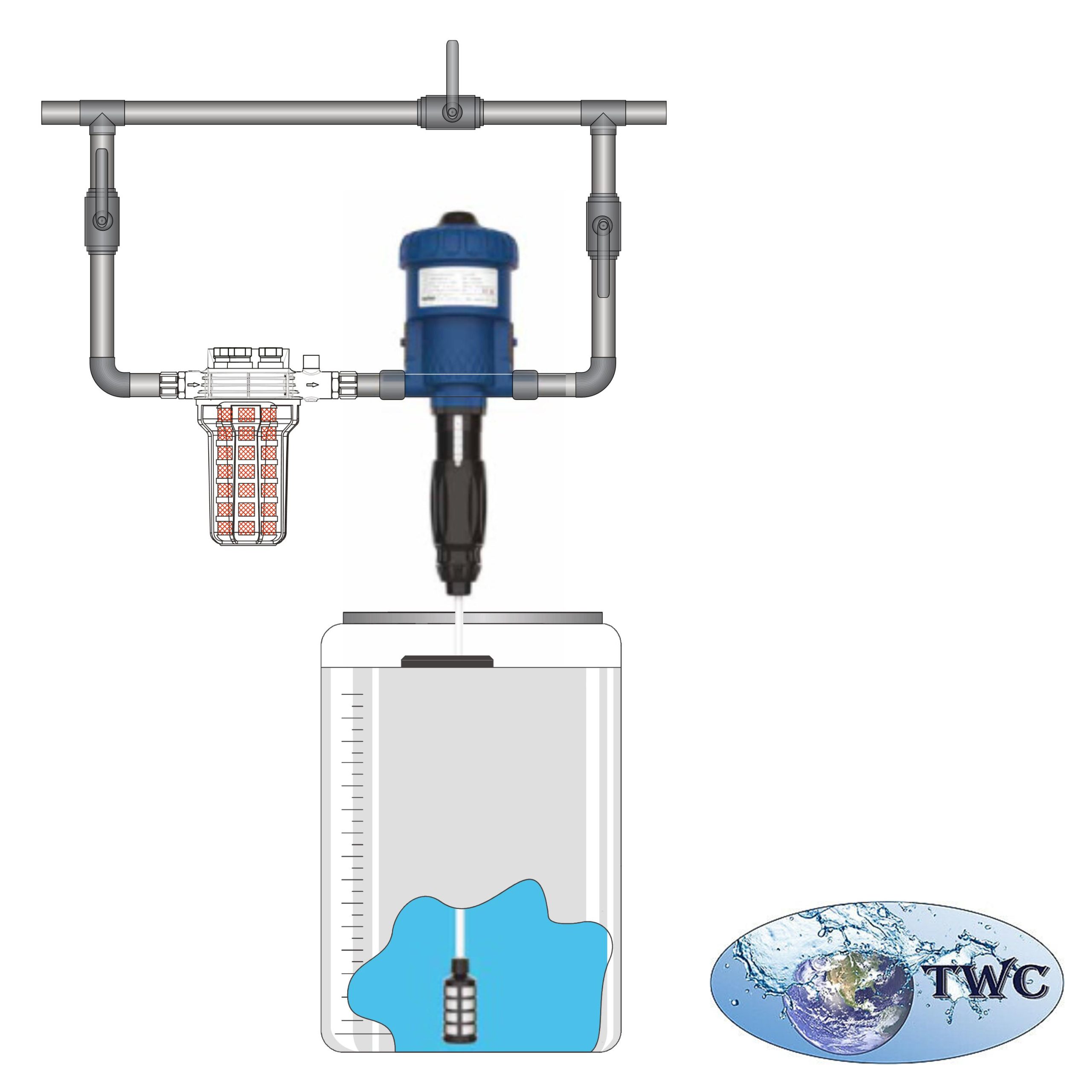- The dose of concentrated product is directly proportional to the volume of water passing through the pump, independent of variations in the flow rate and pressure of the mains water supply.